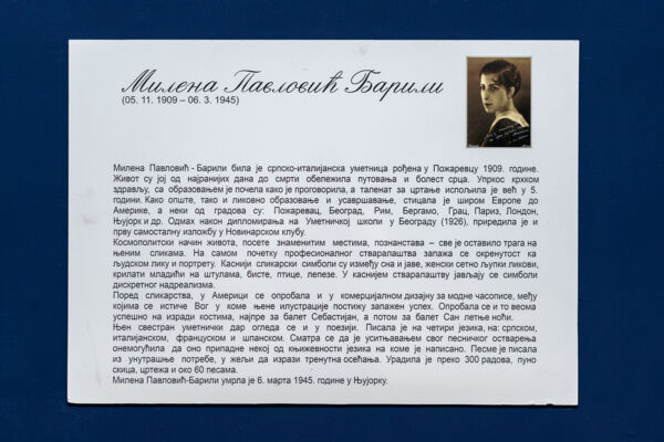 У Новосадском дечијем културном центру, Радничка 20/И у понедељак 10. марта у 12 часова отварена је изложба репродукција „Модни цртеж Милене Павловић Барили“, из колекције Италијанског института за културу у Београда, коју чине 30 панела, димензија 50×70цм у боји.